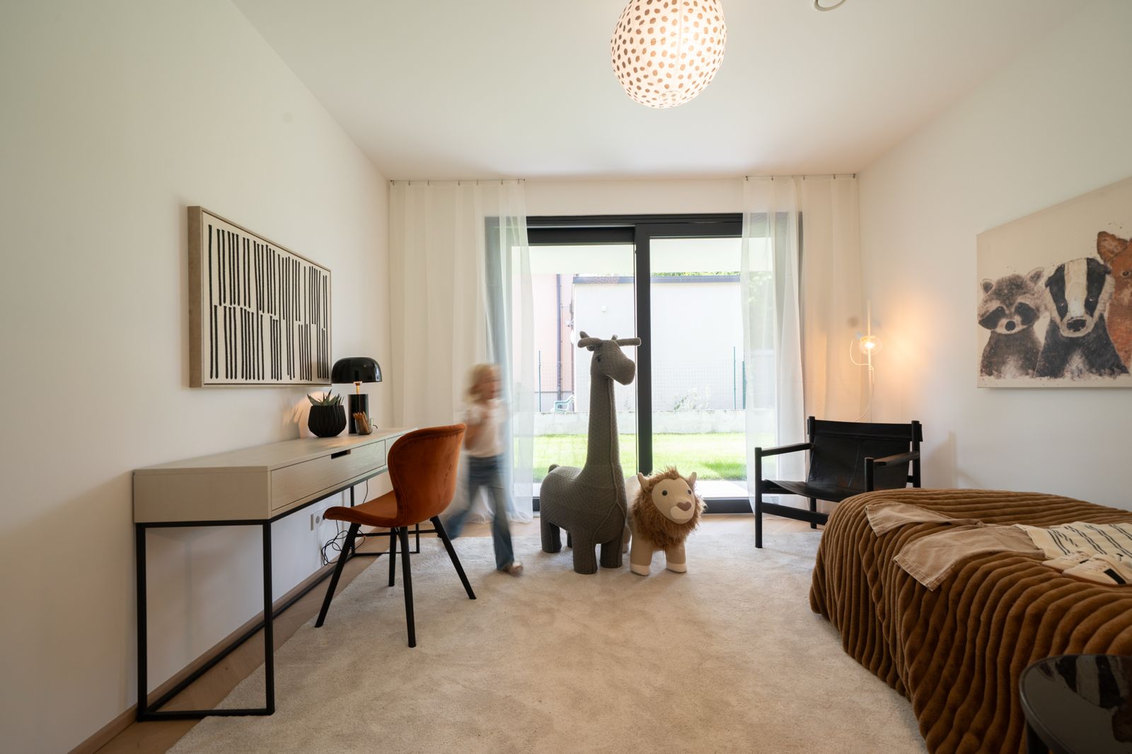 Durch die grüne, naturnahe Lage am Mühlwasser bietet sich die Wohnung besonders für Familien an – ein liebevoll gestaltetes Kinderzimmer zeigt, wie selbstverständlich sich das Konzept auf den Alltag mit einem Kind übertragen lässt.