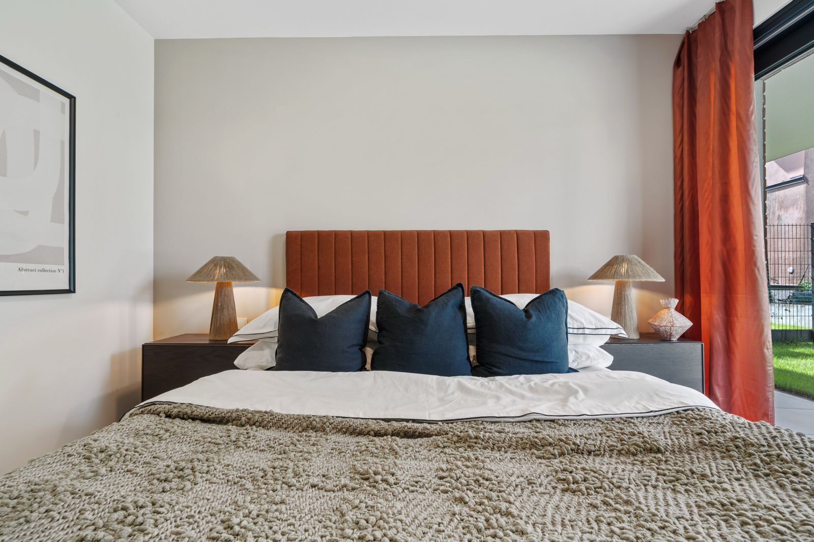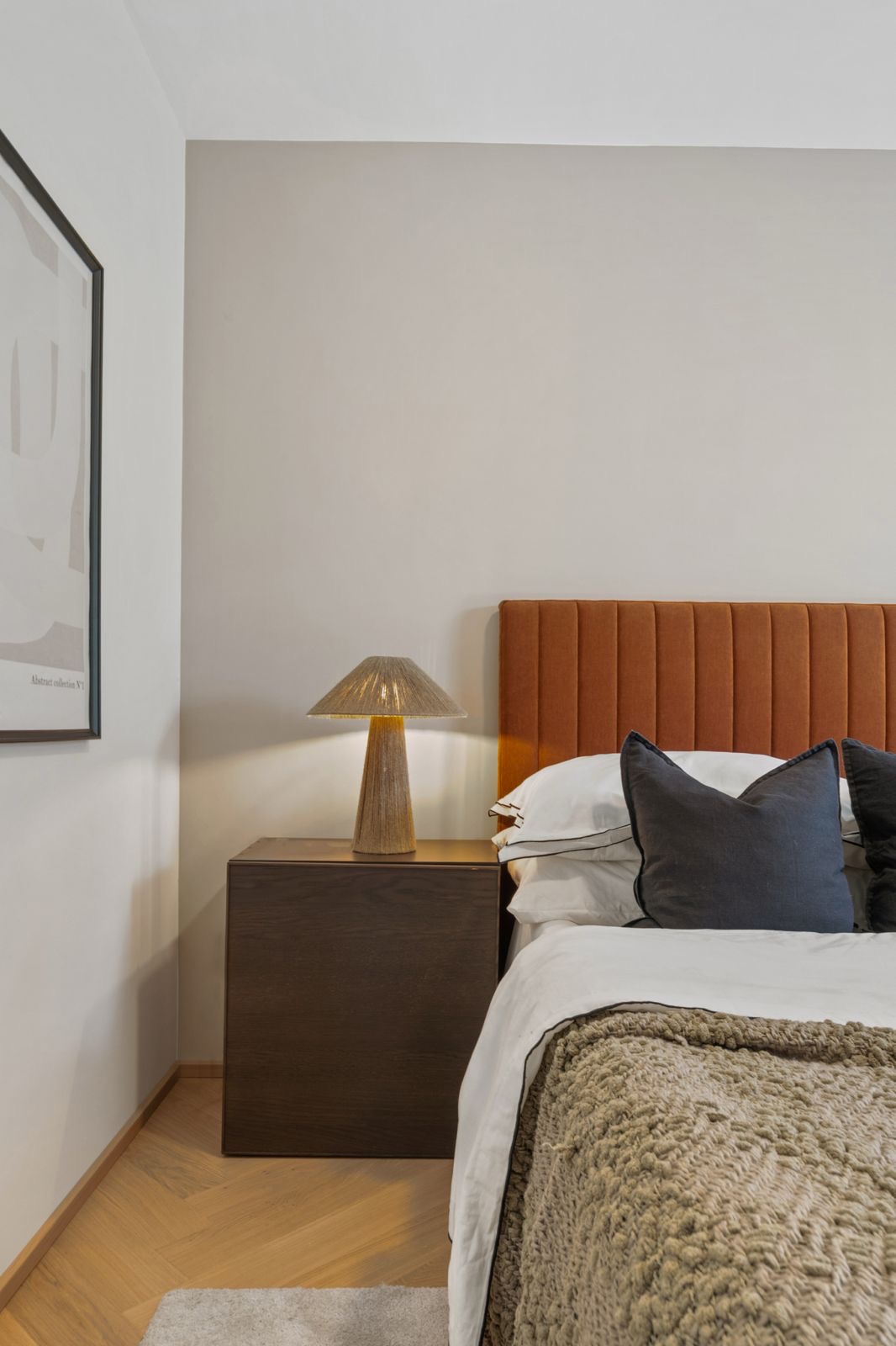 In dieser Musterwohnung greifen wir die Burnt-Orange-Backsteinfassade des Neubaus im Interior bewusst auf: warme Naturtöne, strukturierte Wandmaterialien und sanfte Texturen schaffen eine hochwertige, moderne Atmosphäre..