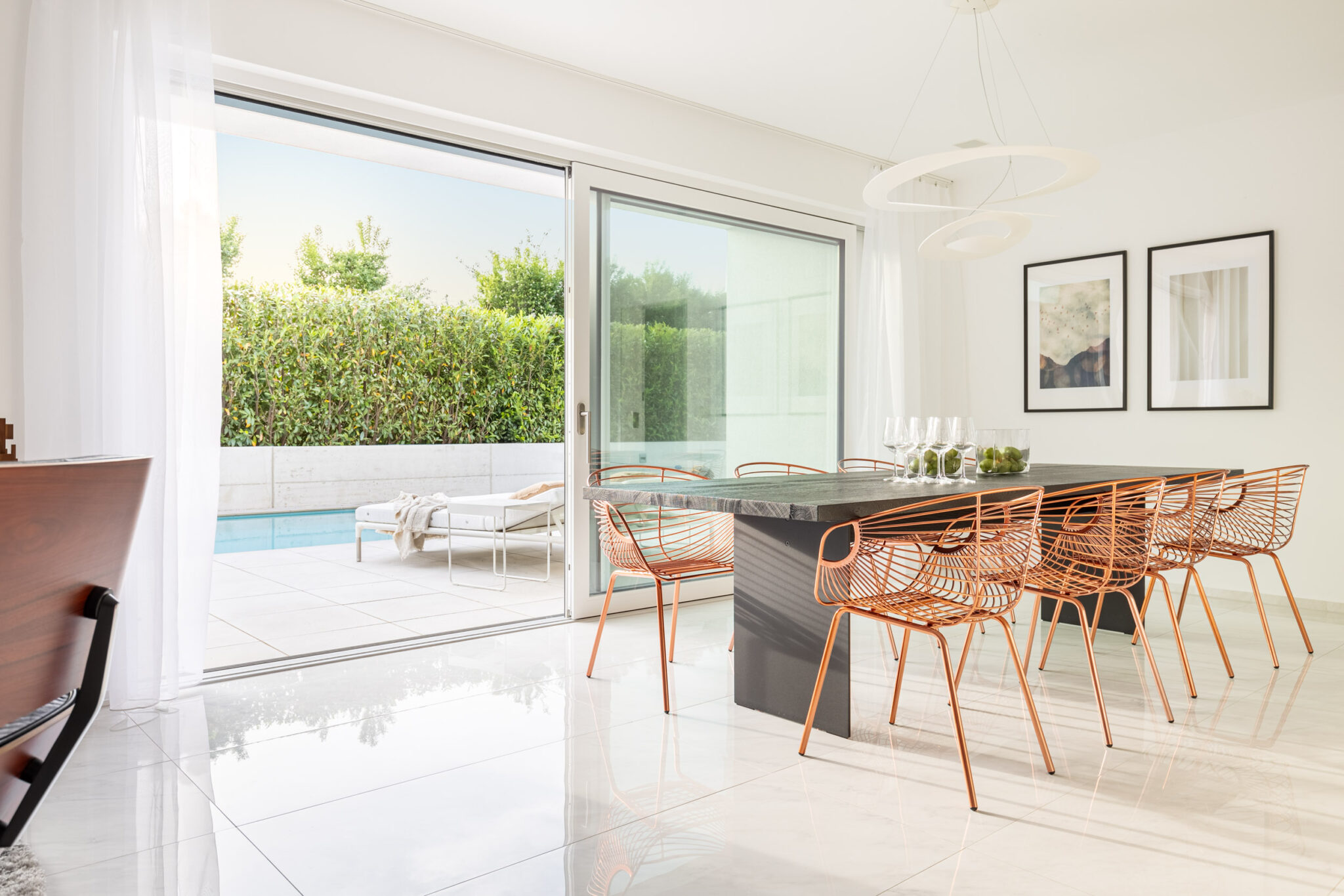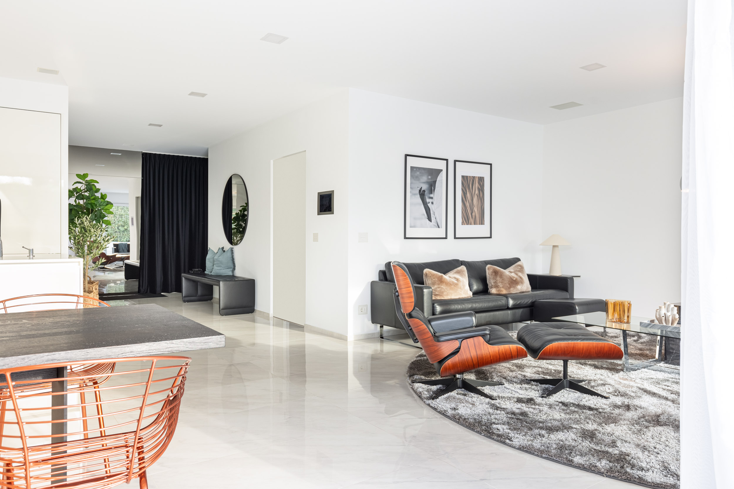 Markante Designstücke – von formstarken Dining Chairs bis zum ikonischen Lounge Chair – setzen bewusst gesetzte Highlights, ohne die Großzügigkeit der Räume zu überladen.