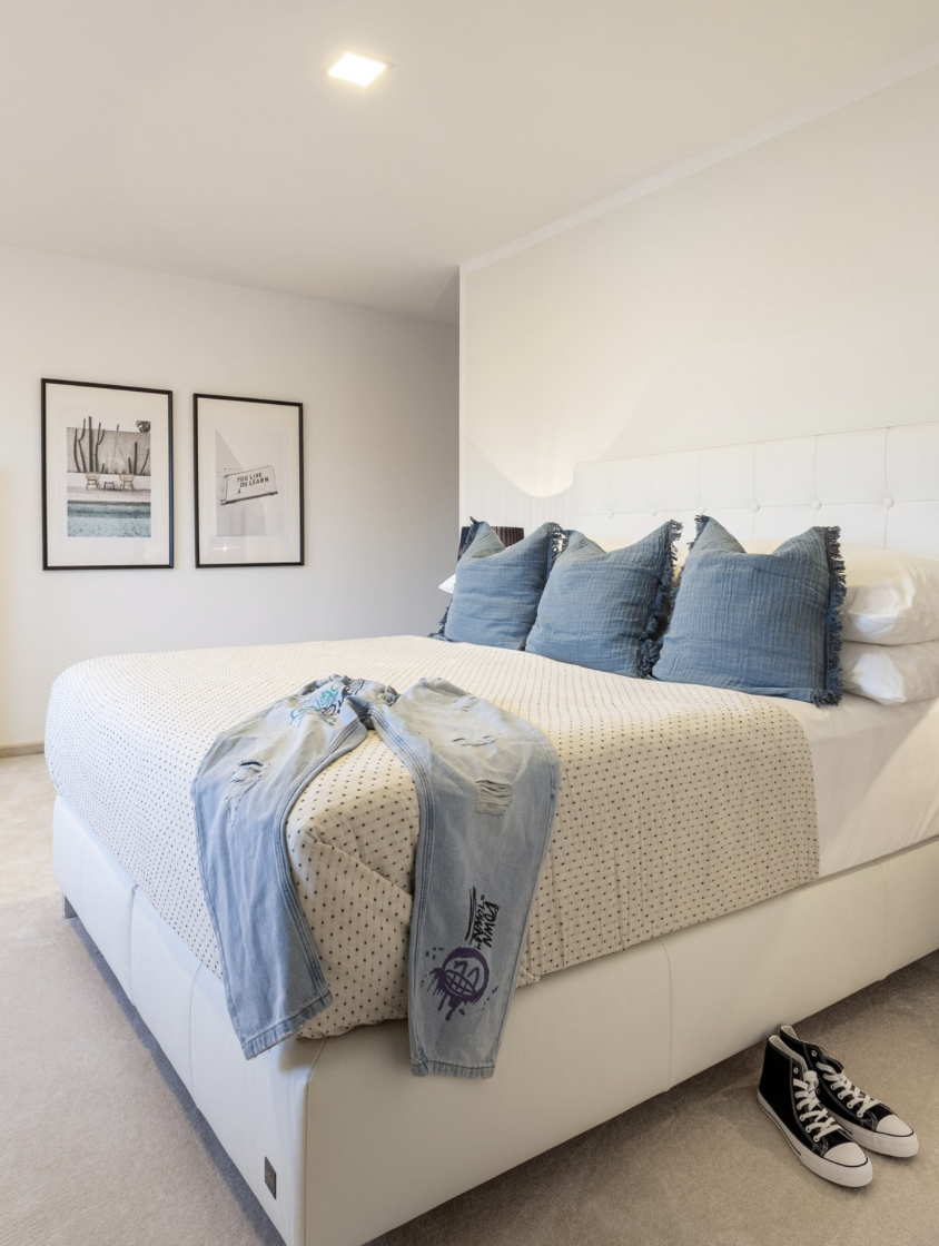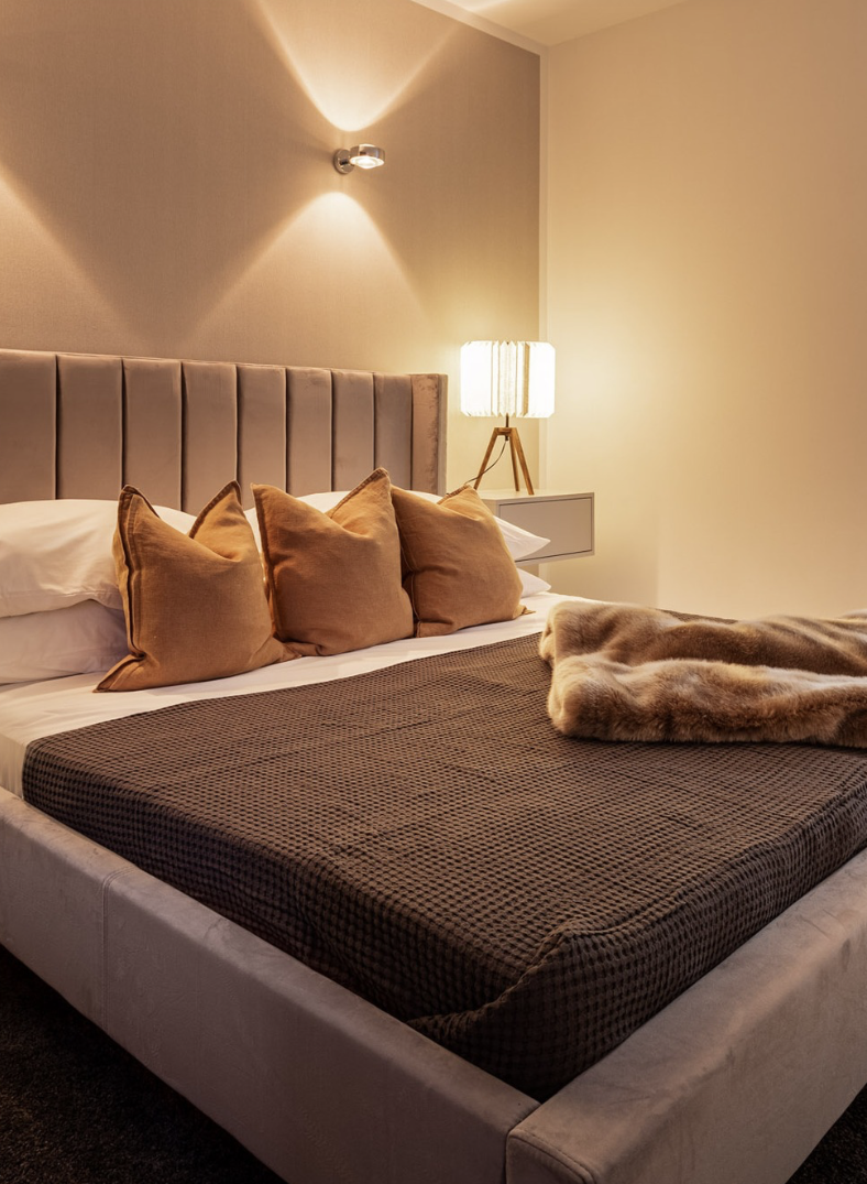 Im Schlafzimmer schaffen Texturen, Lichtstimmung und ein abgestimmtes Farbspiel eine ruhige, exklusive Atmosphäre, die sofort emotional wirkt.
