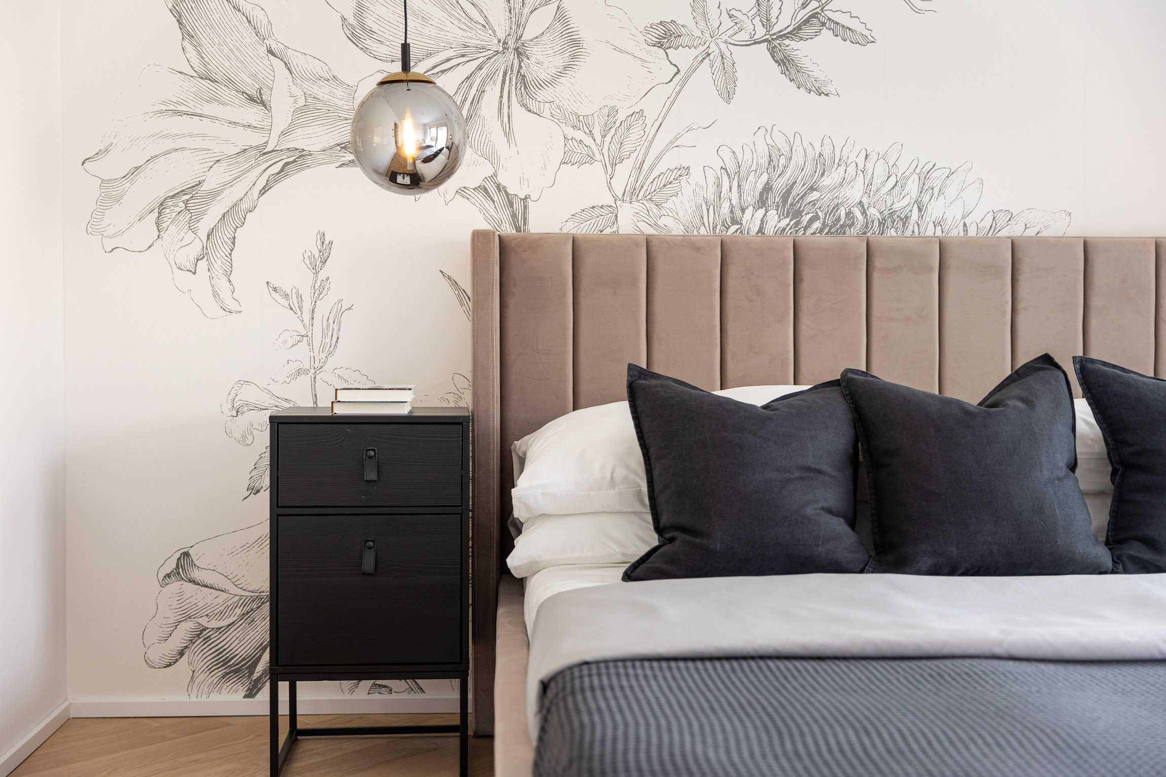 Die Schlafräume greifen diese Linie auf: sanfte Farben, haptische Materialien und eine klare Möblierung erzeugen ein harmonisches, einladendes Ambiente – ergänzt durch zurückhaltende, florale Tapeten, die dem Raum zusätzliche Weichheit und visuelle Tiefe geben.